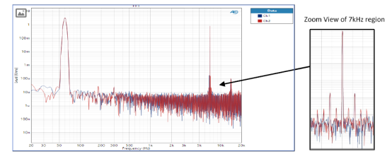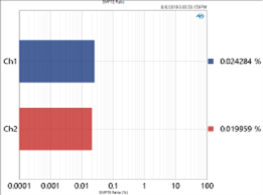 感興趣的諧波現(xiàn)在位于7kHz音調(diào)附近。在120 Hz、180 Hz等頻率下看到的60 Hz音調(diào)的任何諧波與本試驗(yàn)無(wú)關(guān)。然后,SMPTE IMD被確定為IMD產(chǎn)品的均方根值水平,表示為f2均方根水平的比值。以下是SMPTE IMD測(cè)試結(jié)果的表示: