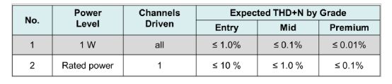 測(cè)試音頻放大器時(shí),通常進(jìn)行兩次THD+N測(cè)量。一個(gè)在1W輸出功率下完成,所有通道同時(shí)驅(qū)動(dòng)。這集中于整個(gè)放大器的小信號(hào)失真。另一種是全功率測(cè)試,只有一個(gè)通道被驅(qū)動(dòng)。這驗(yàn)證了DUT可以達(dá)到預(yù)期的最大功率水平設(shè)計(jì)目標(biāo),同時(shí)滿足失真性能設(shè)計(jì)目標(biāo)。當(dāng)放大器的功率從1W輸出參考電平增加到最大額定功率輸出時(shí),THD+N百分比可以增加10倍或更多。以下是目標(biāo)THD+N性能規(guī)格與設(shè)備等級(jí)的對(duì)比示例: