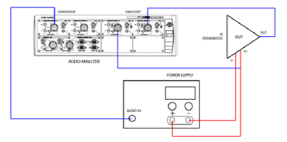 執(zhí)行這些測(cè)試所需的儀器包括音頻分析儀、能夠輸出9至16 VDC的直流電源、功率計(jì)(用于效率測(cè)量)和萬(wàn)用表(用于檢查負(fù)載和電源電壓)。所需的其他測(cè)試項(xiàng)目包括被測(cè)放大器的額定阻抗和輸出功率的非電感負(fù)載電阻器,以及將DUT(被測(cè)設(shè)備)和測(cè)試設(shè)備連接到公共接地的接地電纜。