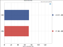 SNR的點(diǎn)。下圖顯示了雙通道放大器上測(cè)得的SNR。這表明,在輸出端,施加信號(hào)的幅度和噪聲本底之間存在超過(guò)70 dB的差異。