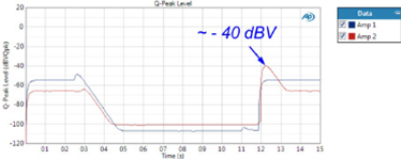 使用APx500分析儀中的測(cè)量記錄儀進(jìn)行采集,顯示在測(cè)試的關(guān)閉和開(kāi)啟部分和/或之后立即出現(xiàn)的瞬態(tài)尖峰。