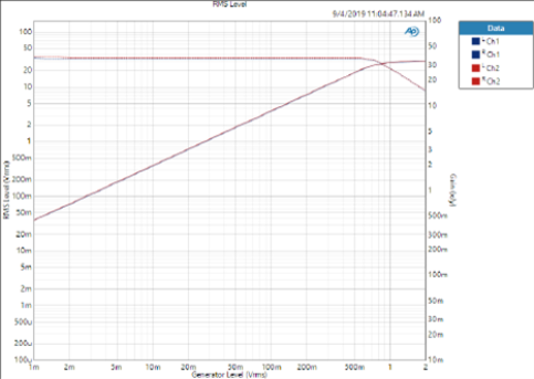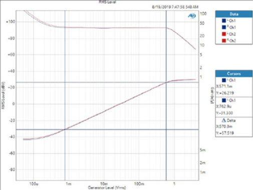 在兩個(gè)通道上同時(shí)測(cè)量輸出電平和增益的同時(shí),通過(guò)應(yīng)用階躍輸入電平掃描,可以方便地執(zhí)行增益和電平測(cè)試。如下圖所示,該放大器的增益約35,如上軌跡(使用右垂直軸)所示,并具有線性響應(yīng),輸入振幅(圖上的水平刻度)從低于2 mVrms到約600 mVrms,然后開(kāi)始在輸出處削波。左軸顯示以Vrms為單位的測(cè)量輸出電平。注意,該DUT的左通道和右通道非常匹配。