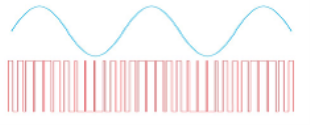 D類(lèi)放大器(有時(shí)稱(chēng)為開(kāi)關(guān)放大器)使用脈寬調(diào)制(PWM)或某些其他類(lèi)型的調(diào)制來(lái)最大化放大器的效率。每個(gè)脈沖的最大導(dǎo)通時(shí)間出現(xiàn)在正峰值,最大關(guān)斷時(shí)間出現(xiàn)在負(fù)峰值。在正弦波的振幅中點(diǎn),占空比約為50%。如下圖所示。
