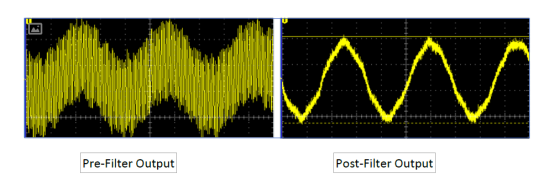 幸運(yùn)的是,這種情況有一個(gè)穩(wěn)健的解決方案。通過(guò)對(duì)輸出進(jìn)行濾波,可以在高頻成分到達(dá)分析儀進(jìn)行測(cè)量之前對(duì)其進(jìn)行濾波,從而顯著減少高頻成分。推薦的過(guò)濾分兩個(gè)階段進(jìn)行。第一級(jí)是連接在放大器輸出和分析儀輸入之間的外部無(wú)源濾波器。這在信號(hào)到達(dá)分析儀之前消除了大部分高頻內(nèi)容。以下信號(hào)捕獲顯示了D類(lèi)放大器的預(yù)濾波和后濾波信號(hào)。