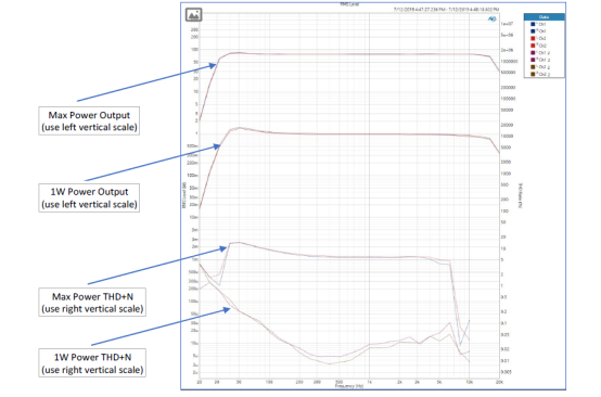 我們?cè)谶@里看到,輸出功率曲線的形狀在功率電平之間是一致的,但THD+N曲線有顯著不同。還請(qǐng)注意,兩條THD+N曲線在約6kHz處急劇下降,這表明當(dāng)諧波超過(guò)帶寬截止值時(shí),該測(cè)量值減小。