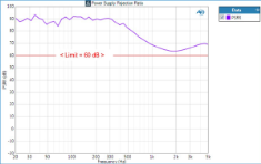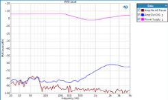 該圖表明,DUT明顯滿足以下測(cè)試極限:≥ 在20Hz至5kHz范圍內(nèi)為60dB。還請(qǐng)注意,由于在20 Hz至約70 Hz的范圍內(nèi),“Amp Out Ch1”電平不高于“Amp No AC電源”,因此我們只能說(shuō)DUT的性能與所示性能相同或更好。理想情況下,電源AC電壓將足夠高,以在所有給定激勵(lì)頻率下在DUT輸出中引起峰值。這可能在所有情況下都不可能。電源的示例設(shè)置可以包括13.8V的DC電平和大約2Vrms的AC電平。