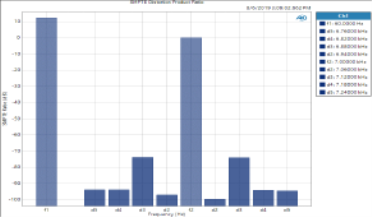 以下是DFD測(cè)試的示例輸出。在這種情況下,施加到DUT的兩個(gè)等幅度音調(diào)是19kHz和20kHz。通過(guò)計(jì)算互調(diào)諧波振幅之和與所施加的兩個(gè)基音振幅之和的比率來(lái)進(jìn)行分析。在該比率中僅考慮二階和三階互調(diào)產(chǎn)物。