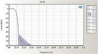 第二個(gè)推薦的濾波級(jí)是分析儀中的銳滾降帶寬限制濾波器。AES17標(biāo)準(zhǔn)建議使用這種濾波器進(jìn)行D/a轉(zhuǎn)換器測(cè)量,該AES17濾波器是D類(lèi)放大器測(cè)量的內(nèi)部濾波器的良好選擇。Audio Precision將其作為APx分析儀中的磚墻DSP濾波器實(shí)現(xiàn)。